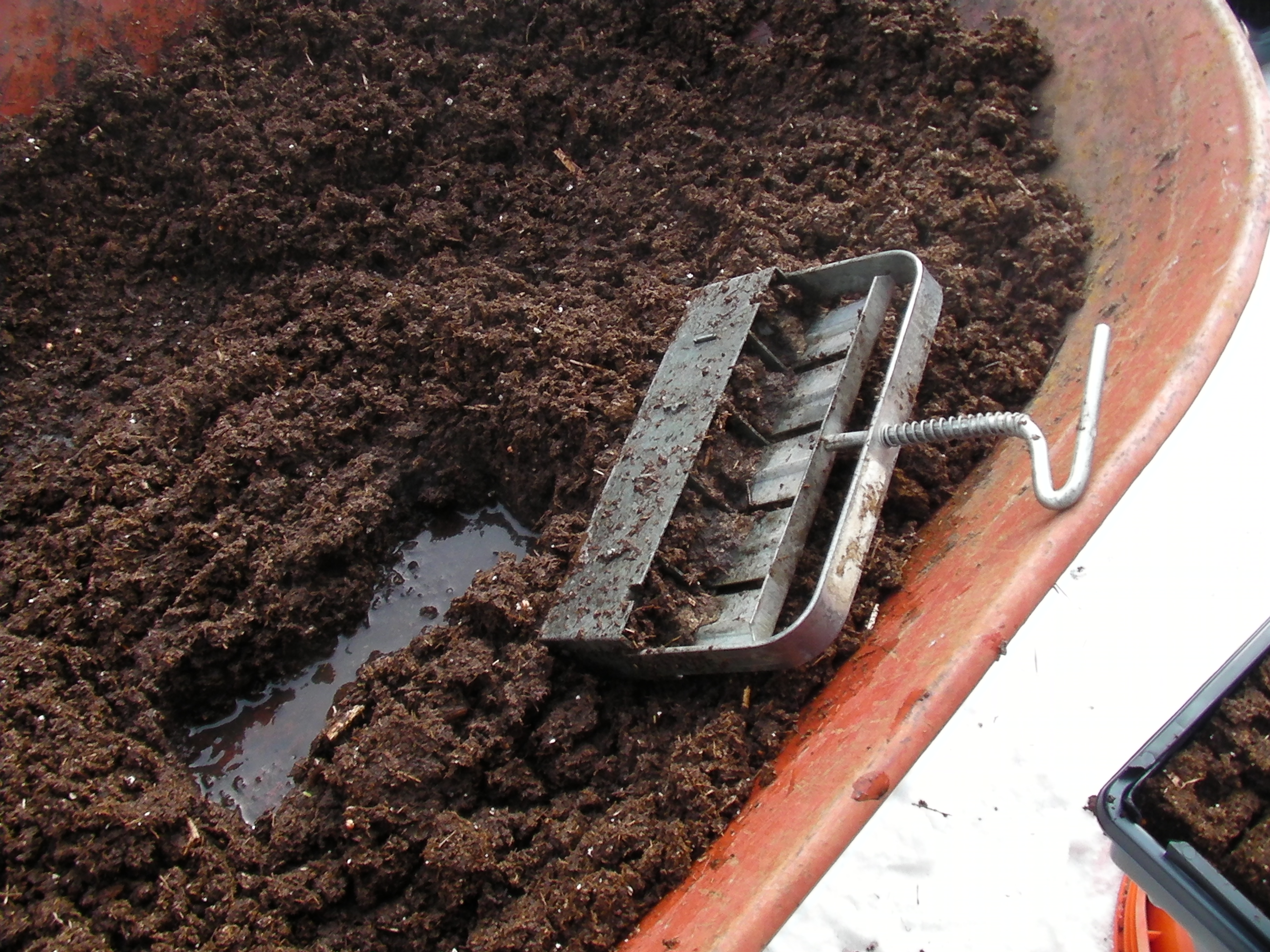 Today, for us, the 2014 growing season has officially begun! We seeded 1400 Redwing onions today, in multi plant soil blocks. First, we mix up the potting mix and get our soil blocker out: