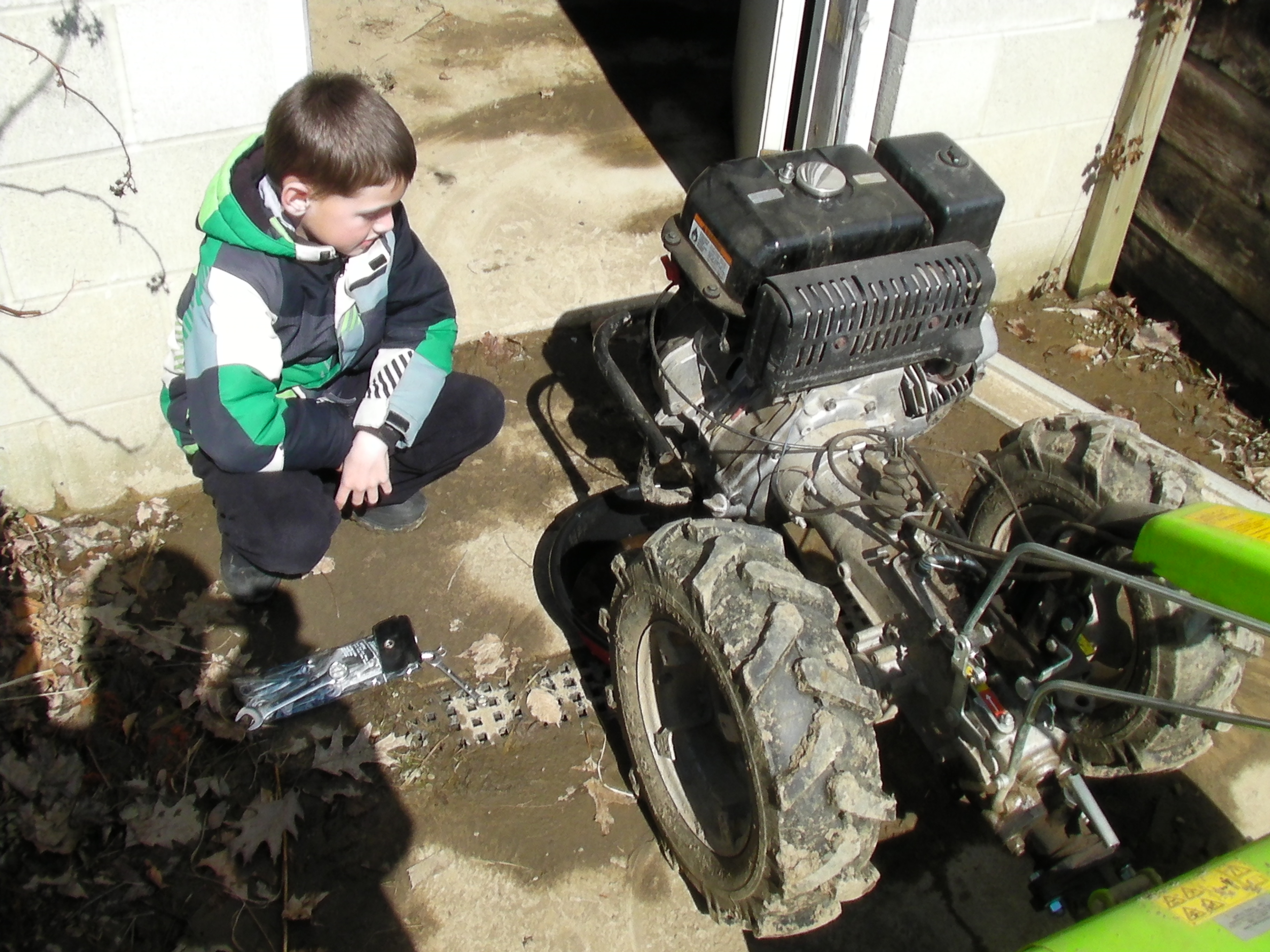 The snow has finally melted and we can see our yard for the first time in months. We went outside and changed the engine oil in the Grillo Tractor: