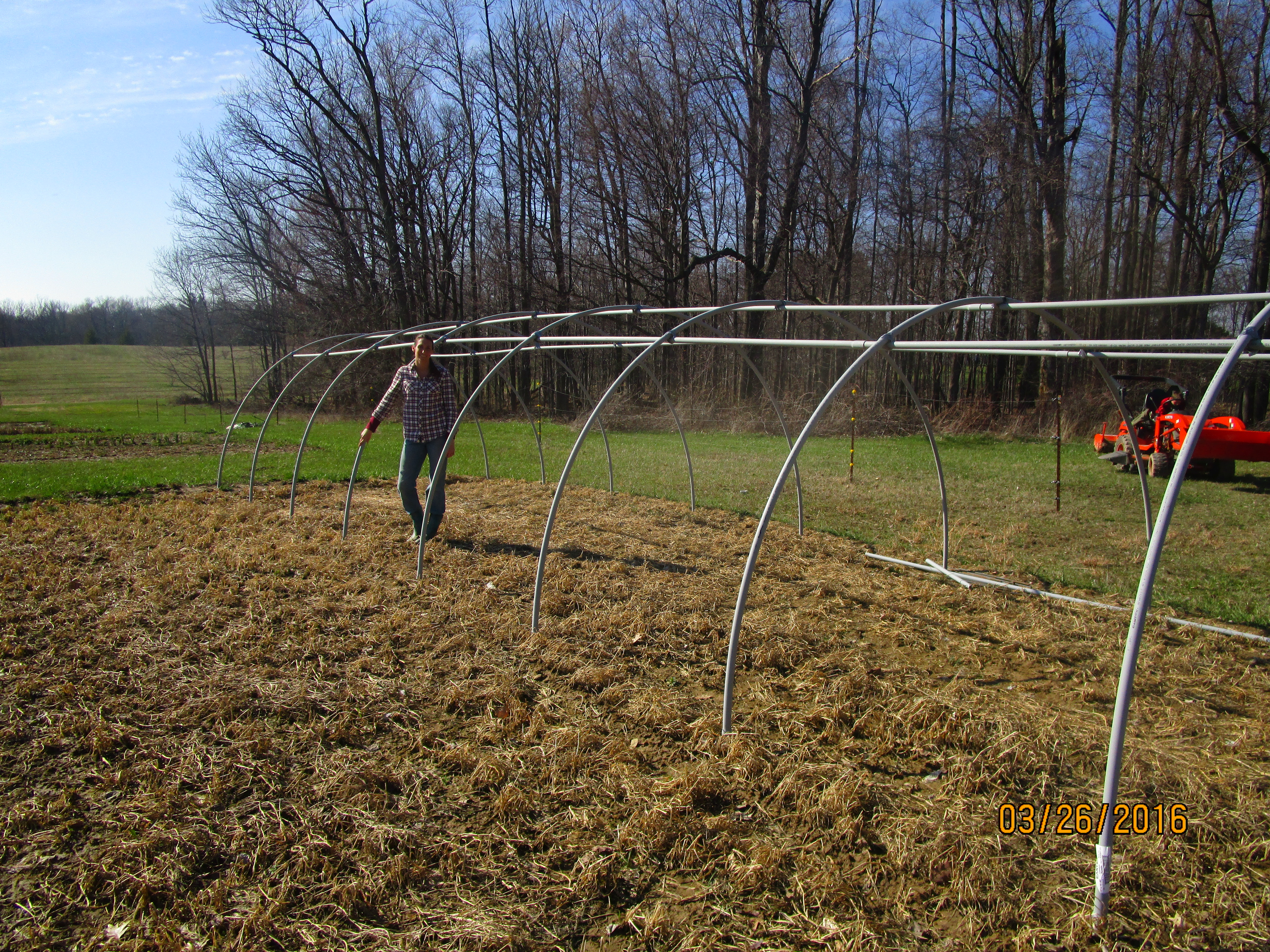 First, we built 2 hoop houses to get warm season crops such as tomatoes and cucumbers to market much earlier